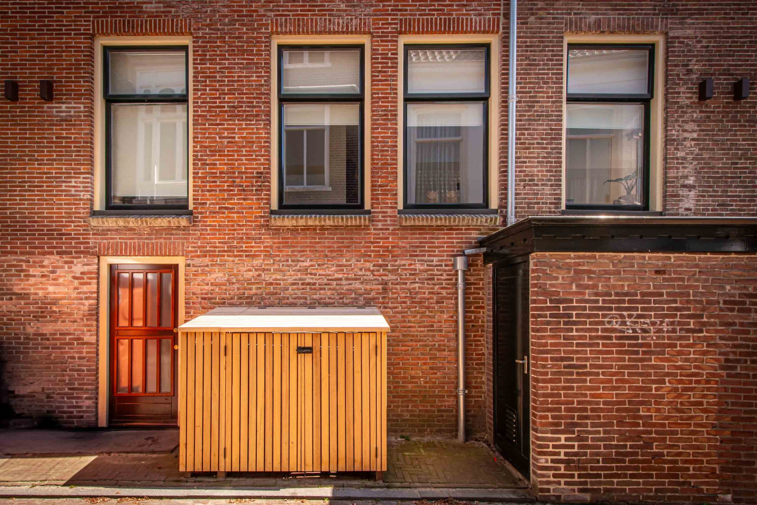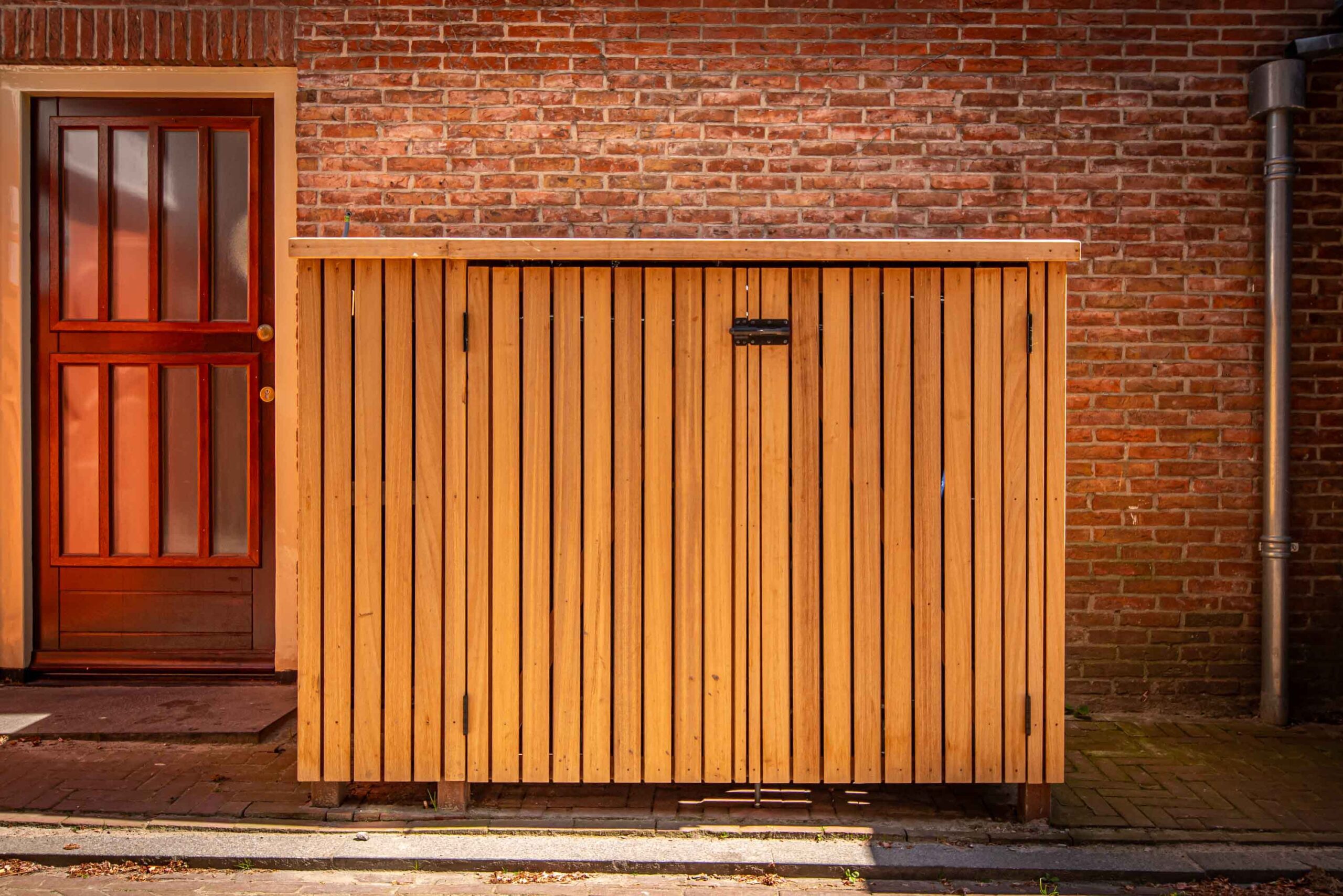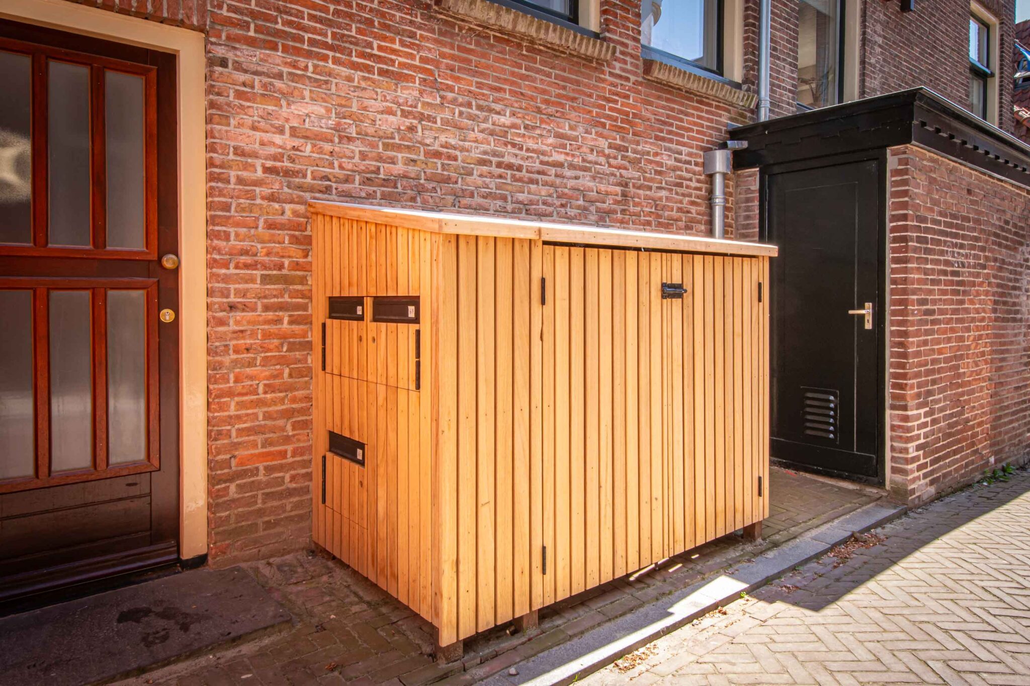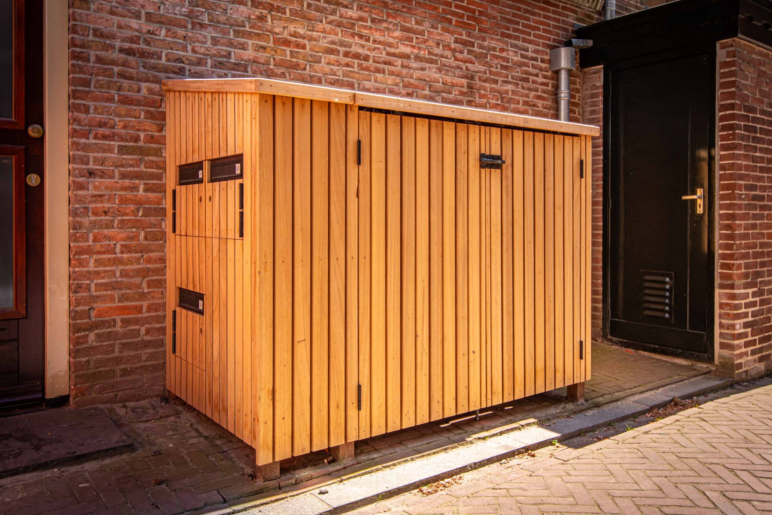 De oplossing is de mooie houten ombouw die onze vakmannen voor de bewoners hebben gemaakt. Afgewerkt in robuust en weerbestendig hout waarin zowel de containers en de post veilig zijn voor invloeden van buitenaf.